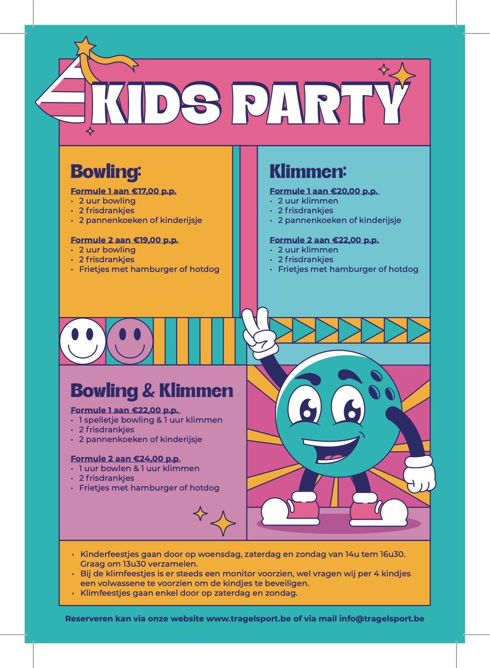 Bij TRAGEL SPORT zorgen we voor supertoffe verjaardagsfeestjes. Nodig jouw vriendjes maar al uit want bij ons kan je bowlen of klimmen, of beide als je niet wil kiezen. Na de activiteit kunnen jullie smullen van lekkere pannenkoeken, ijsjes, hot dogs of hamburgers.